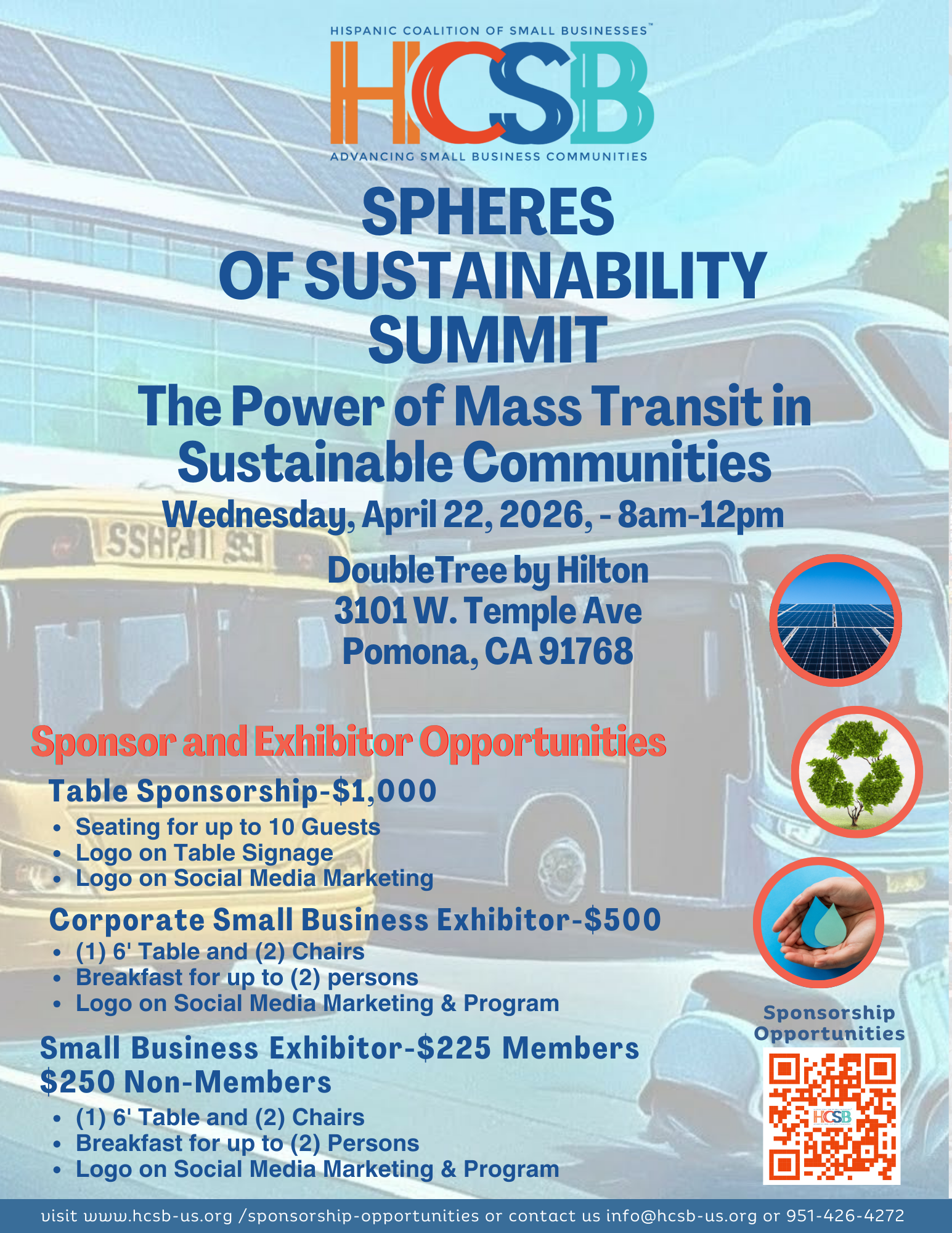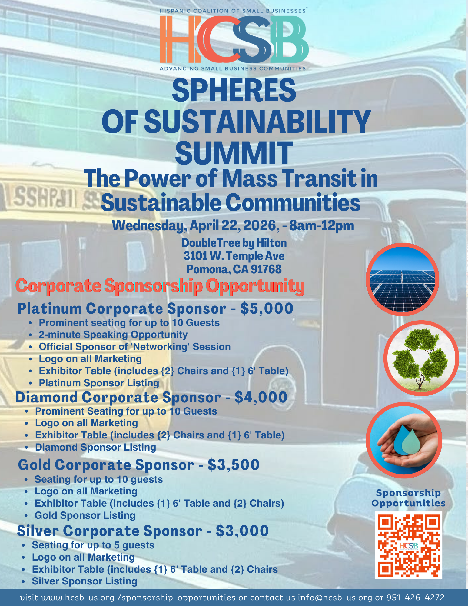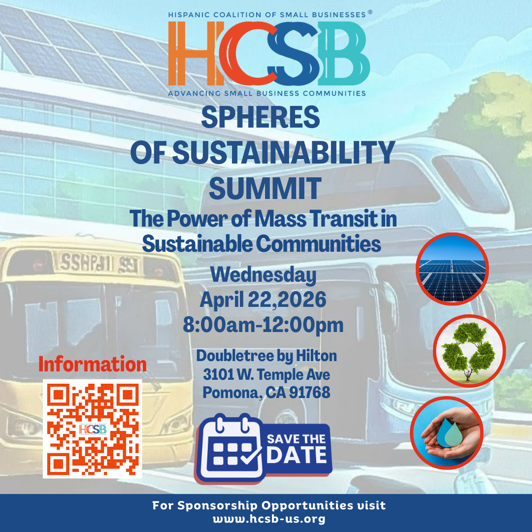 Join the Hispanic Coalition of Small Businesses (HCSB) on Earth Day, April 22, 2026, at the DoubleTree by Hilton Pomona for a high-impact Sustainability Summit focused on sustainable mass transit, workforce pathways, and small business opportunity.